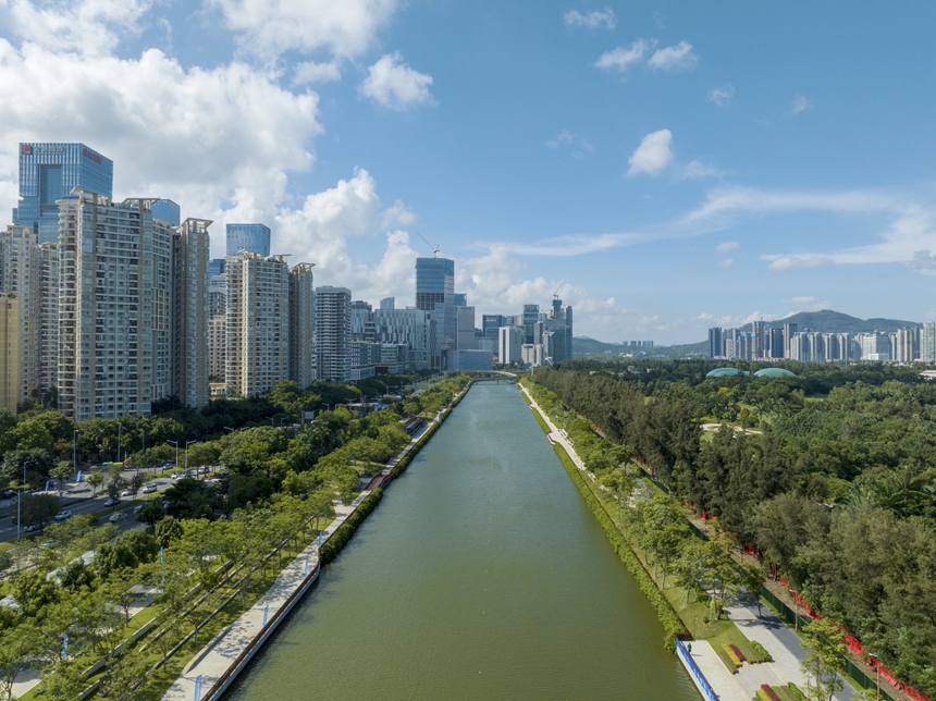 11月的深圳,粉色異木棉競(jìng)相綻放,居民沿著濱水棧道慢跑、騎行,成排的賽艇在碼頭停靠。沿著河道蜿蜒南下,一路抵達(dá)深圳灣入???。恰逢退潮,灘涂魚在沙灘上跳躍,海鴨等水鳥正沿著浪花邊緣覓食。