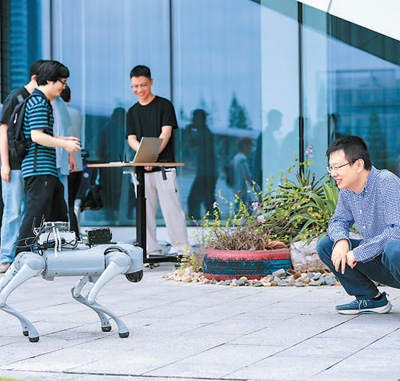 在深圳大學(xué)校友廣場(chǎng),人工智能學(xué)院的機(jī)器狗展品引起到訪嘉賓的關(guān)注。