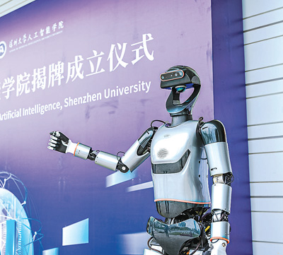 在深圳大學(xué)人工智能學(xué)院揭牌成立儀式現(xiàn)場(chǎng),機(jī)器人向到訪嘉賓揮手致意。
