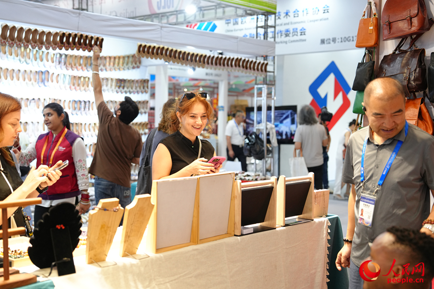 印度展區(qū)一側(cè),墻上掛滿了傳統(tǒng)手工鞋,刺繡、珠串和印花造型精致繁復(fù)。“這是復(fù)古風(fēng)格的手工鞋,有多種美麗款式,穿上軟軟的,很舒服?!笨吹綆孜挥^眾駐足觀望,印度籍志愿者沃林達·辛格拉主動迎上去推薦道。