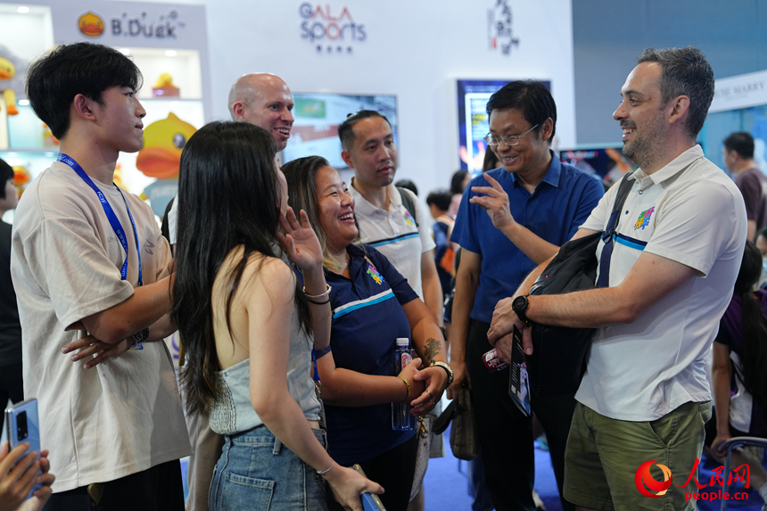 深圳前海展區(qū),麗林維育學(xué)校的老師和參展商交流。人民網(wǎng) 劉森君攝
