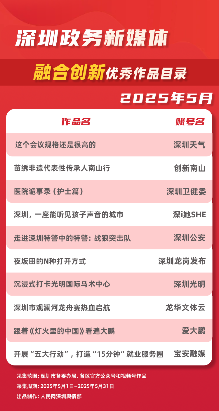 人民網(wǎng)深圳6月10日電 2025年5月深圳政務新媒體“融合創(chuàng)新”和“信息發(fā)布”優(yōu)秀作品目錄,近日揭曉。