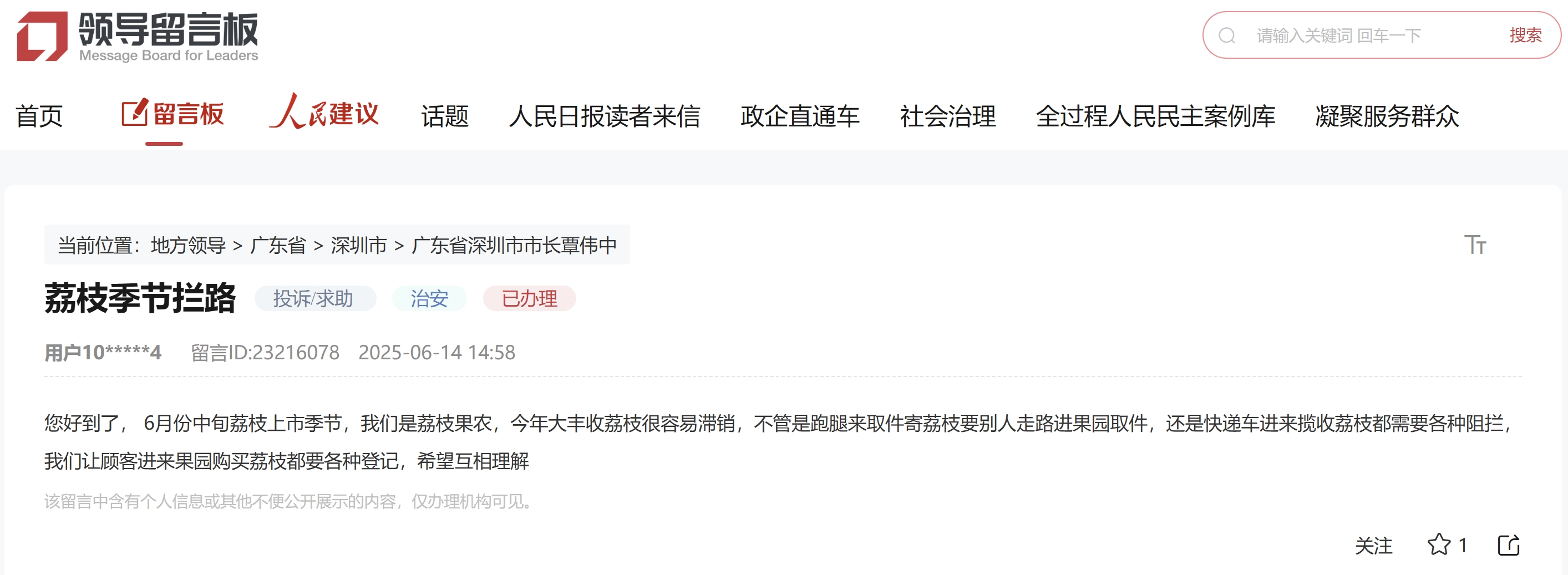 人民網(wǎng)深圳6月24日電 (劉森君)“荔枝過(guò)夜就容易壞,可運(yùn)輸車(chē)被攔路!”近日,有深圳市南山區(qū)的荔枝種植戶在人民網(wǎng)“領(lǐng)導(dǎo)留言板”反映,正值豐收季節(jié),由于南山環(huán)西麗湖綠道(碧道)區(qū)域限制車(chē)輛進(jìn)出,數(shù)十戶果農(nóng)銷(xiāo)售受影響。