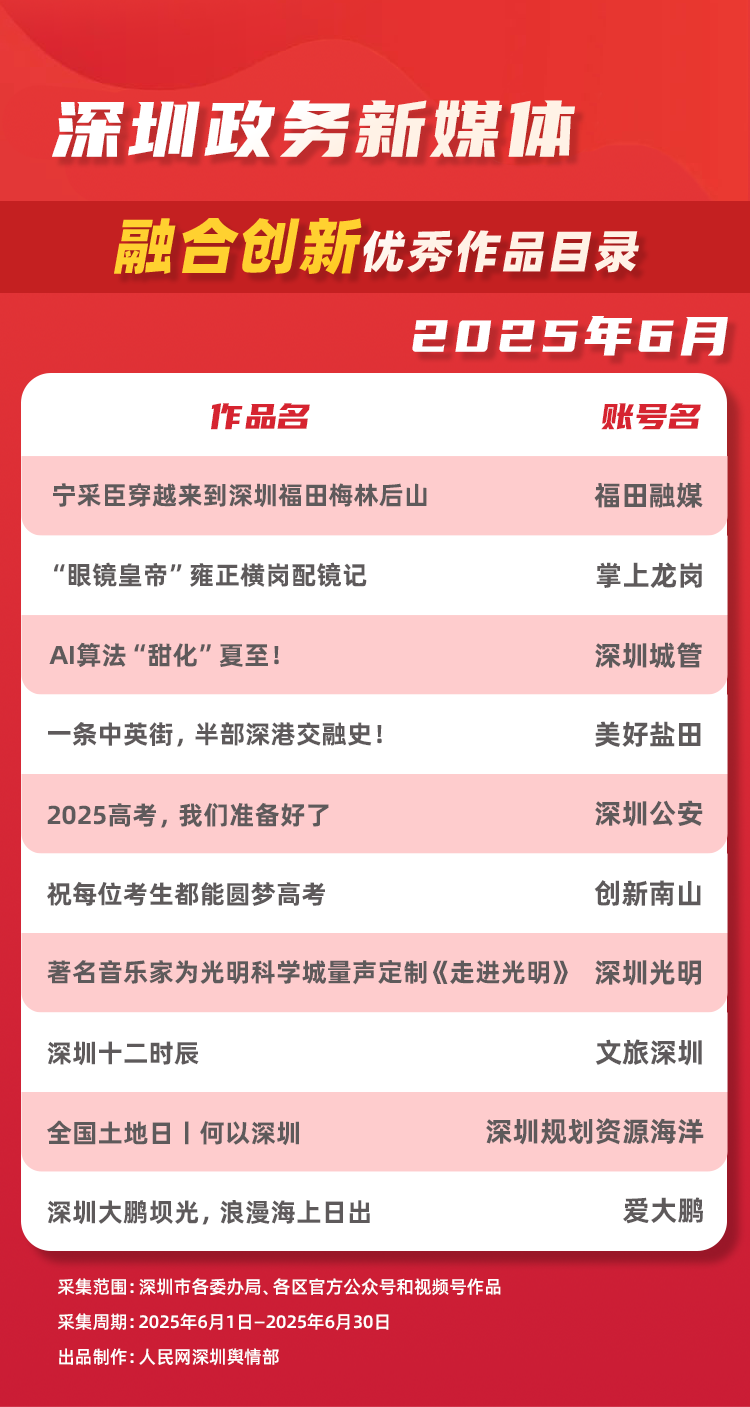人民網(wǎng)深圳7月10日電 2025年6月深圳政務(wù)新媒體“融合創(chuàng)新”和“信息發(fā)布”優(yōu)秀作品目錄,近日揭曉。