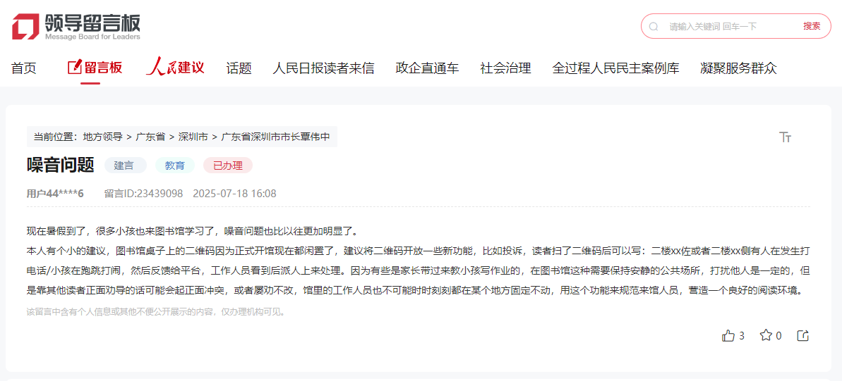 人民網(wǎng)深圳7月31日電 (劉森君)近日,有深圳讀者在人民網(wǎng)“領(lǐng)導(dǎo)留言板”反映,暑假期間,深圳圖書館北館比平時吵鬧,影響閱讀體驗,希望完善投訴功能。