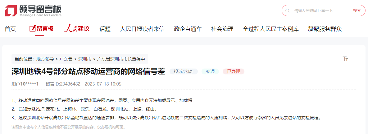 人民網(wǎng)深圳8月6日電 (劉森君)“移動運營商的網(wǎng)絡(luò)信號差,地鐵上網(wǎng)頁、應(yīng)用的內(nèi)容加載慢、加載不出來?!苯?,有深圳市民在人民網(wǎng)“領(lǐng)導留言板”反映,深圳地鐵4號線部分站點車上信號差。