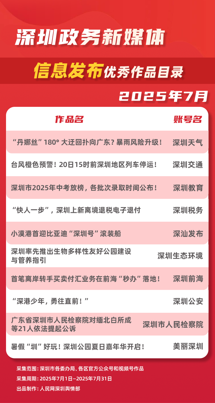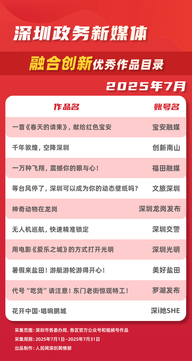 人民網(wǎng)深圳8月11日電 2025年7月深圳政務(wù)新媒體“融合創(chuàng)新”和“信息發(fā)布”優(yōu)秀作品目錄,近日揭曉。