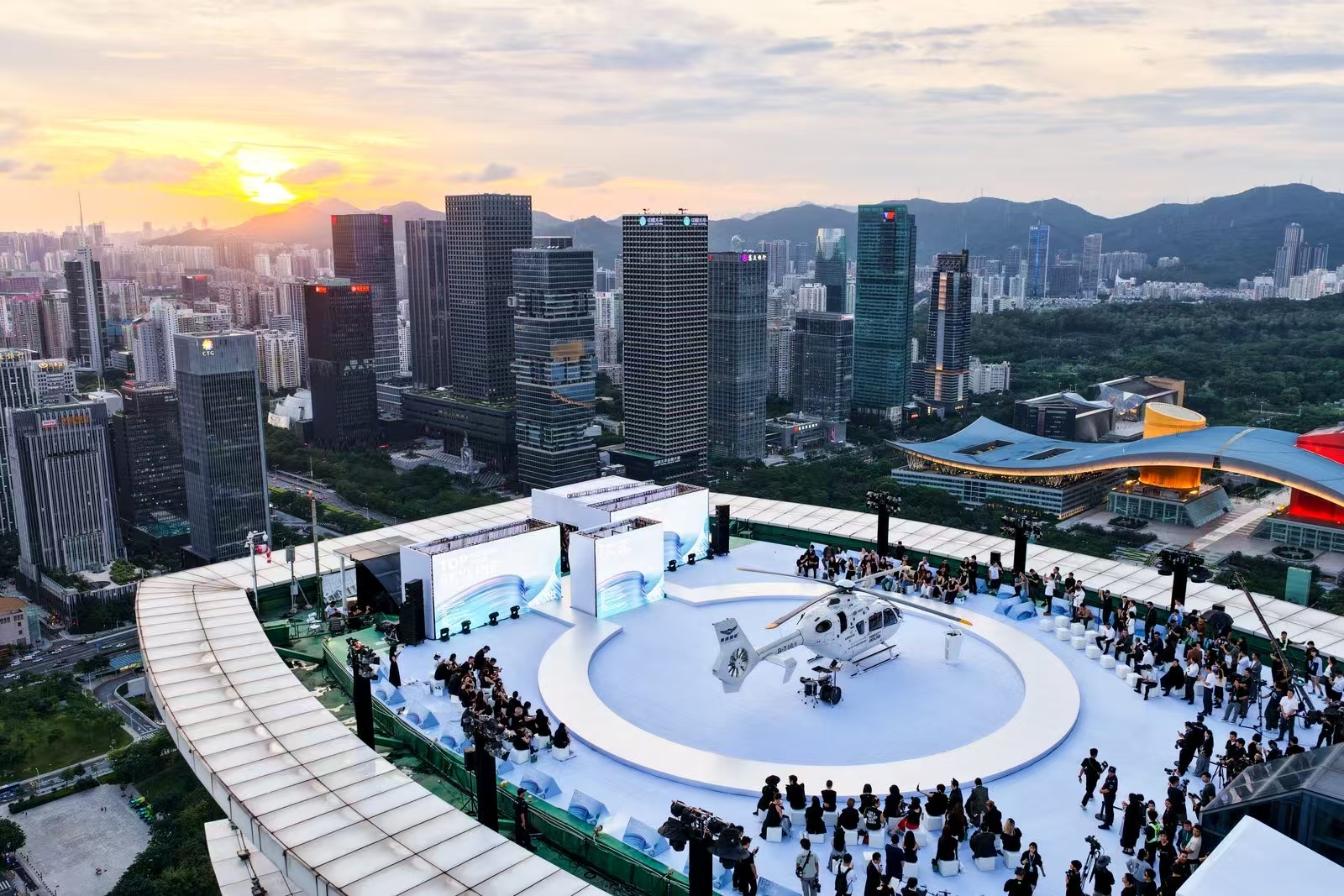 暮色漸沉,深圳的天際線浸染在深邃藍(lán)調(diào)中。福田區(qū)大中華頂樓,直升機(jī)停機(jī)坪燈光亮起,一場(chǎng)“天空大秀”就此拉開(kāi)帷幕。
