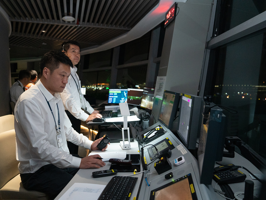 深圳空管站塔臺管制員指揮試飛飛機進行驗證飛行。董思文攝