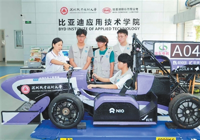 深圳職業(yè)技術(shù)大學(xué)與行業(yè)協(xié)會(huì)、世界500強(qiáng)企業(yè)等共建產(chǎn)教融合聯(lián)合體,打造16個(gè)特色產(chǎn)業(yè)學(xué)院。圖為比亞迪應(yīng)用技術(shù)學(xué)院教師張亞琛(左一)指導(dǎo)深圳職業(yè)技術(shù)大學(xué)魅影方程式賽車隊(duì)改進(jìn)方程式賽車,該車隊(duì)已連續(xù)多年獲得全國大學(xué)生方程式大賽獎(jiǎng)項(xiàng)。張 雷攝(人民視覺)