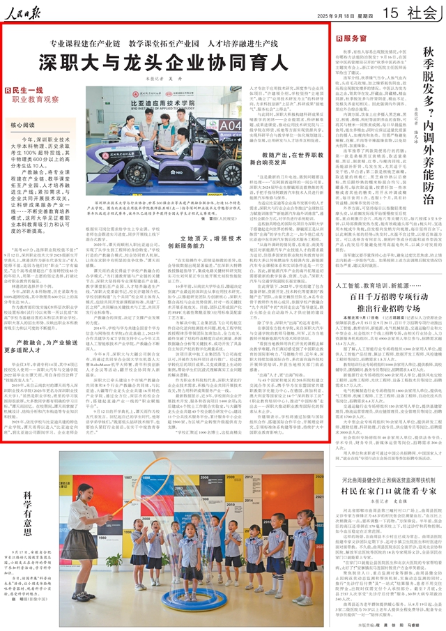 深職大已牽頭建設(shè)1個(gè)市域產(chǎn)教融合共同體和8個(gè)行業(yè)產(chǎn)教融合共同體,與比亞迪、大疆等行業(yè)龍頭企業(yè)共建16所特色產(chǎn)業(yè)學(xué)院,通過全方位、深層次的校企合作,搭建起直通產(chǎn)業(yè)一線的“職業(yè)賦能平臺(tái)”。
