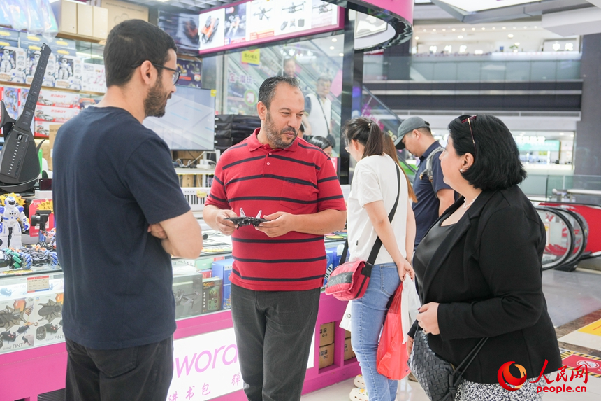 調(diào)研團(tuán)成員(右一)在華強(qiáng)北與國(guó)際采購(gòu)商交流。人民網(wǎng) 王星攝