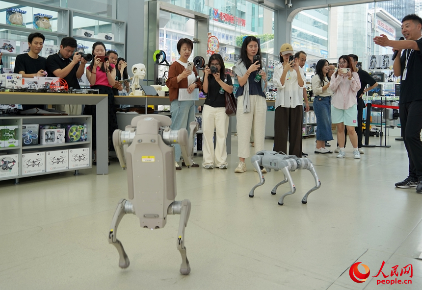 調(diào)研團(tuán)在華強(qiáng)北觀看機(jī)器狗表演。人民網(wǎng) 王星攝