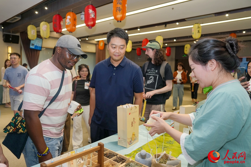 調(diào)研團(tuán)成員觀看制作中藥香囊。人民網(wǎng) 王星攝