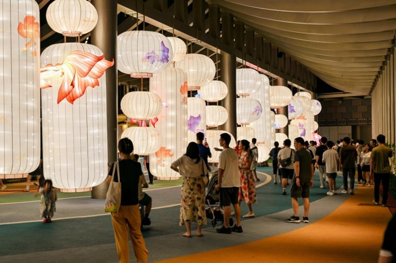 同期,“魚燈渡”主題的20米彩燈秀將持續(xù)展出至10月底,配合簪花體驗(yàn)、猜燈謎、彩燈手作等互動(dòng)環(huán)節(jié),以及“逐月拾遺”非遺扎染市集,共同構(gòu)建出“夜游、夜賞、夜娛”的沉浸式文化場(chǎng)景。
