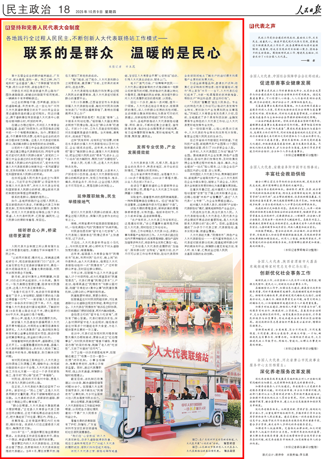如今,各地積極踐行全過程人民民主,落實新修改的代表法,不斷健全代表工作制度機制,支持和保障代表依法履職、發(fā)揮作用。依托人大代表聯(lián)絡(luò)站等線上線下多元渠道,人大代表聽民聲、匯民智、解民憂,讓人民群眾的期盼有著落、有回應(yīng)。