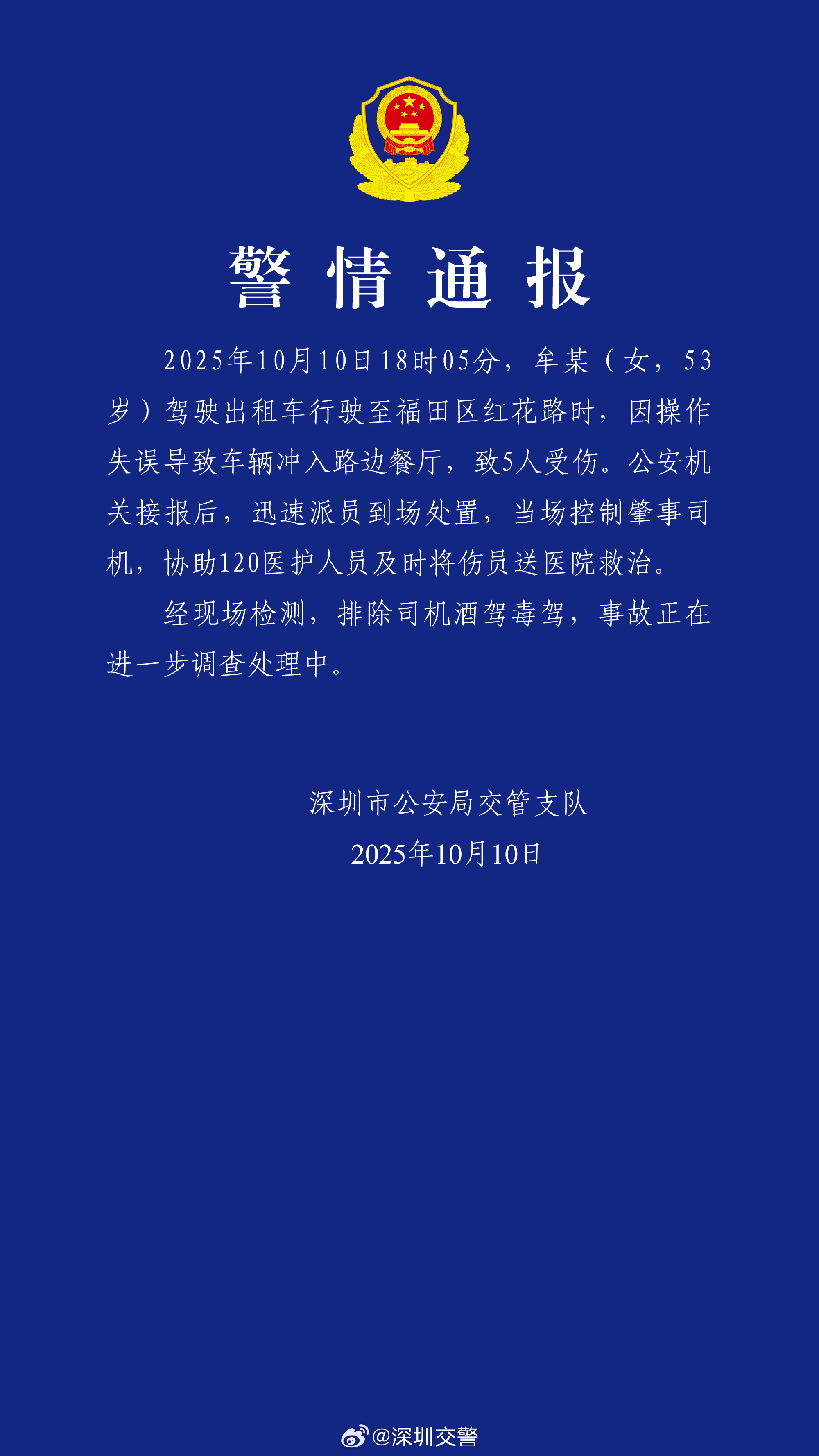 人民網(wǎng)深圳10月10日電 (王星) 據(jù)深圳市公安局交管支隊(duì)通報(bào),今日18時(shí)05分,牟某(女,53歲)駕駛出租車行駛至福田區(qū)紅花路時(shí),因操作失誤導(dǎo)致車輛沖入路邊餐廳,致5人受傷。