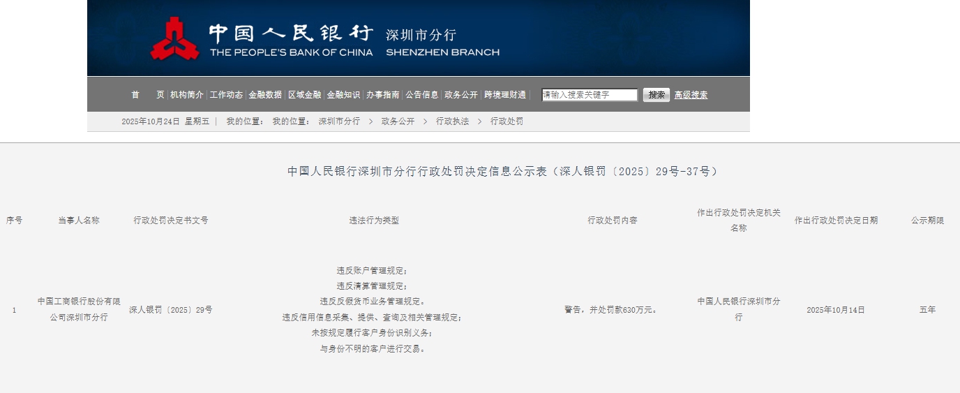 人民網(wǎng)深圳10月24日電 (劉森君)10月23日,中國人民銀行深圳市分行公示行政處罰最新信息,工商銀行深圳市分行因6項(xiàng)違法行為被警告,并處罰款630萬元。